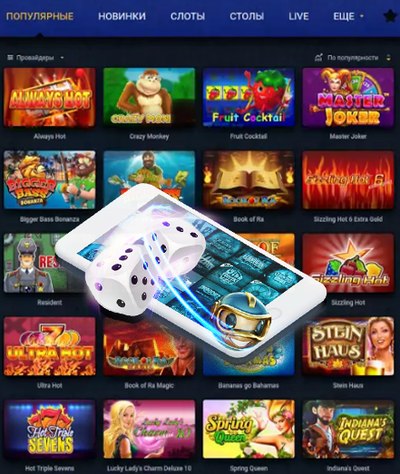 Ассортимент онлайн казино насчитывает более 800 различных игровых автоматов. Пользователи могут выбрать слоты, однорукие бандиты, игры с живыми дилерами, лотереи, видеослоты. Список регулярно обновляется, добавляются новинки. Наиболее популярные игры с высокой отдачей попадают на главную страницу. Топ 5 автоматов на деньги: